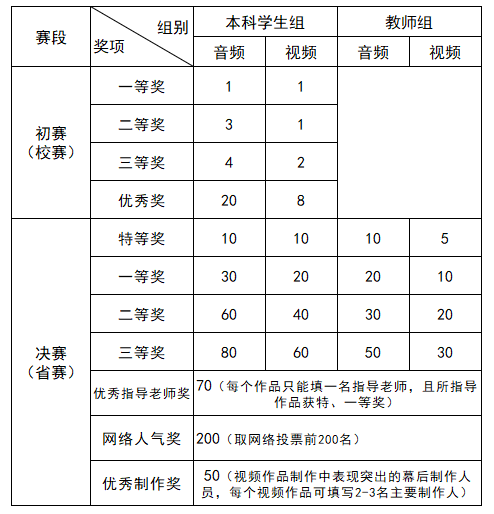 2、省赛特、一、二、三等奖:音频与视频分别进行评选,各设置以上作品奖数量,评委会将从主题内容、语言表达、情感演绎、形象气质等方面对决赛作品进行综合评分。