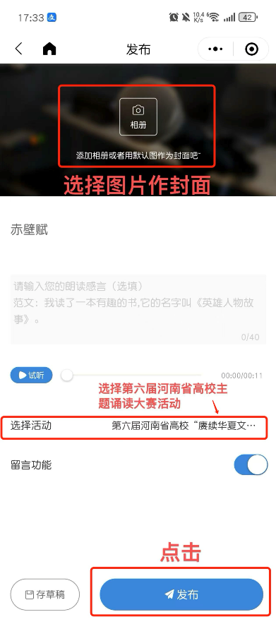 4. 诵读完成后,点击“完成”,点击相册添加喜欢的图片或使用默认图做封面,在“选择活动”处确认提交至“阅见新时代·声传家国情 ”第七届主题诵读大赛活动”,点击“发布”,即作品提交参赛成功。