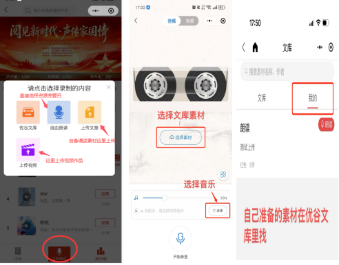 3. 报名信息填写后,即可进入作品录制及提交,参赛选手可围绕“阅见新时代·声传家国情 ”主题,选择合适的素材进行诵读(可参考“学习强国”、“优谷文库”等资源库),搭配配乐进行创作(录制前在右下角“更换”选择自己喜欢的配乐);