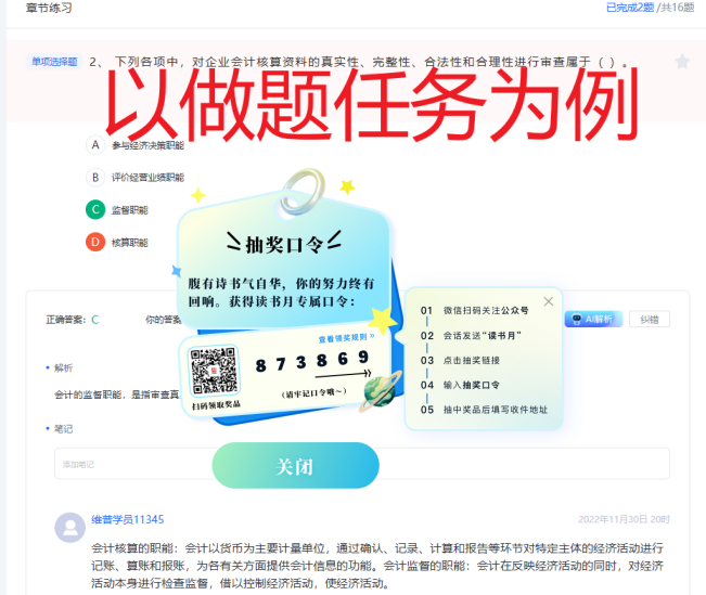 第二,完成任务完成平台任一指定学习任务,即可获得活动抽奖弹窗,按照弹窗指示,扫码关注【维普考试】公众号,并牢记抽奖口令(很重要!!!);